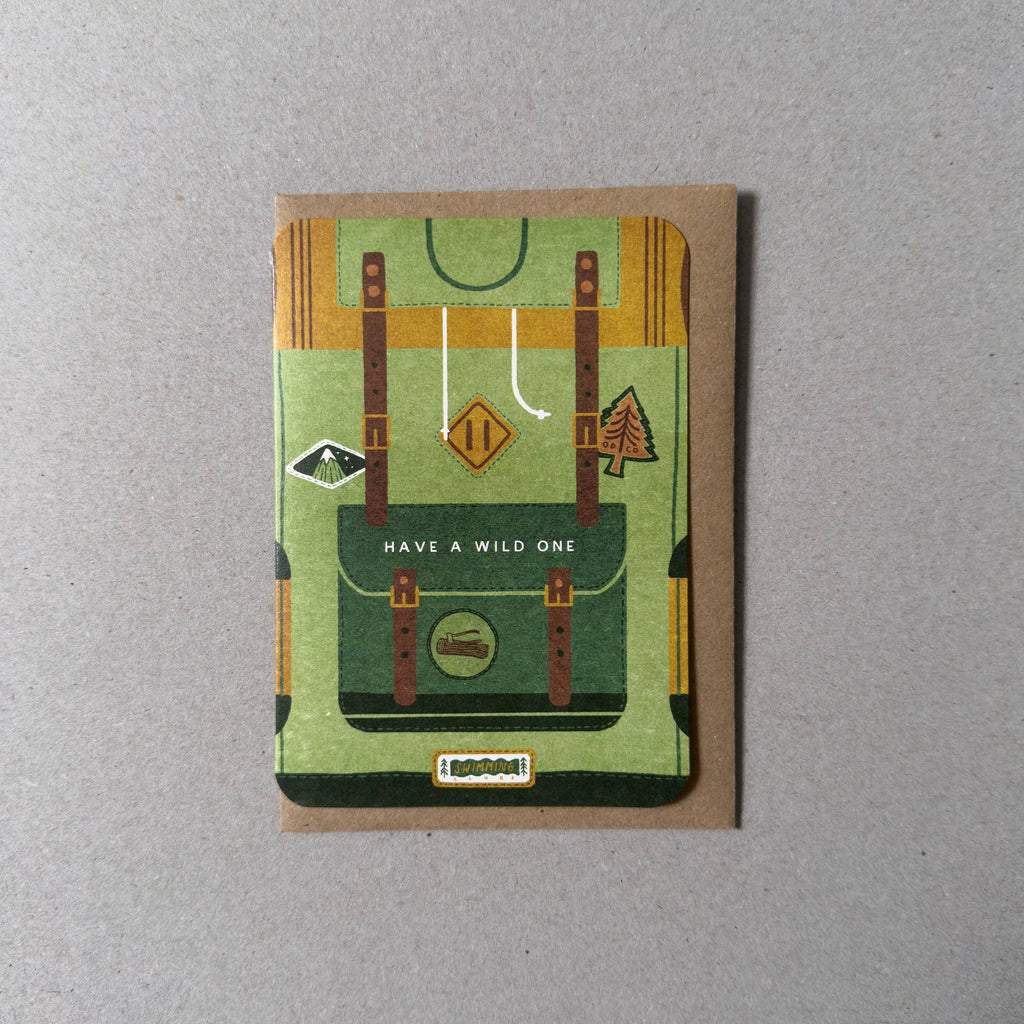Illustrated Greeting Card featuring double sided 'Backpack' artwork and 'Have a Wild One' wording.