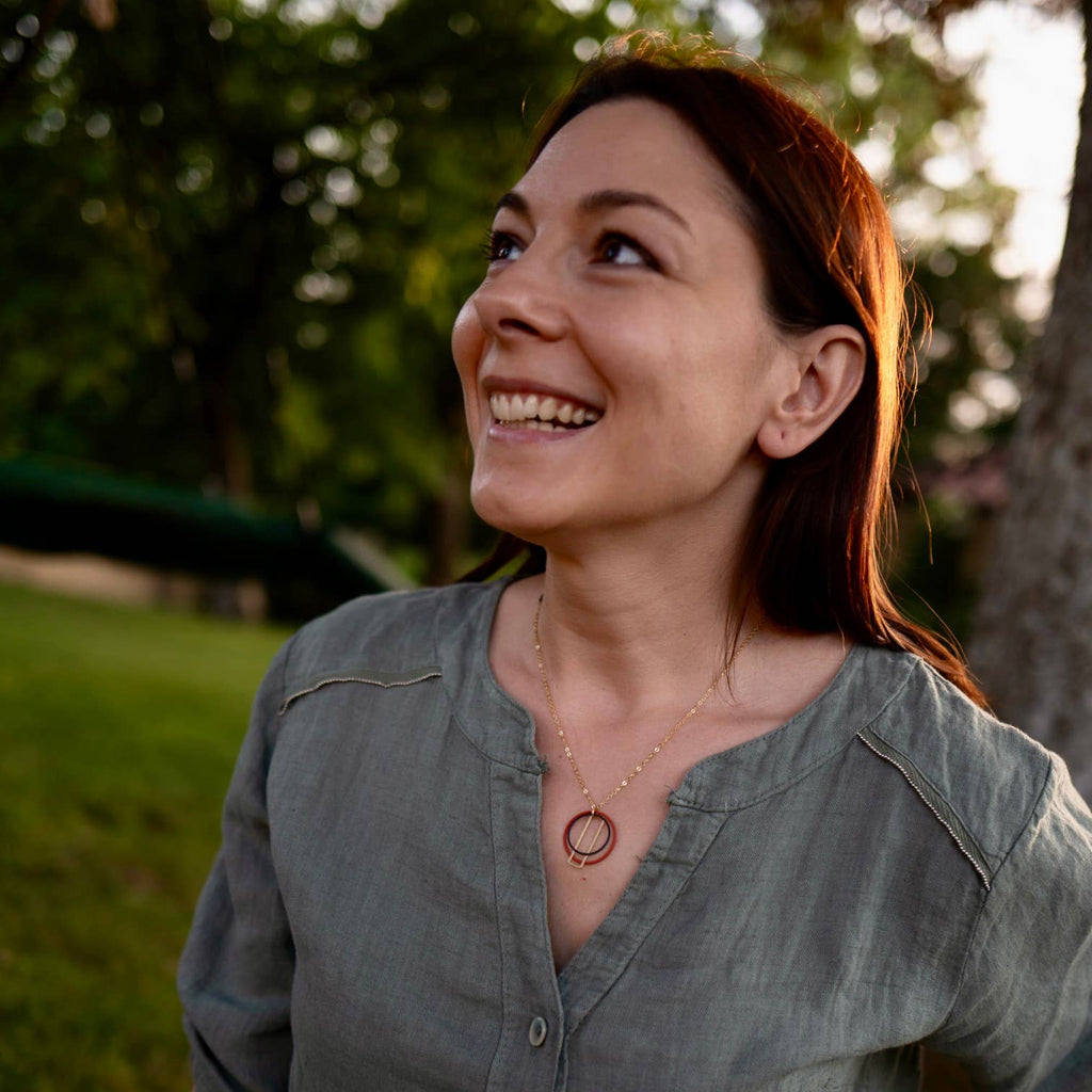 The Modular Necklace is a bold yet refined composition of intersecting shapes, materials, and colour. A rust orange-coated hoop encircles a black oxidised ring, contrasted with a vertical brass rectangle — each element suspended together in perfect balance.