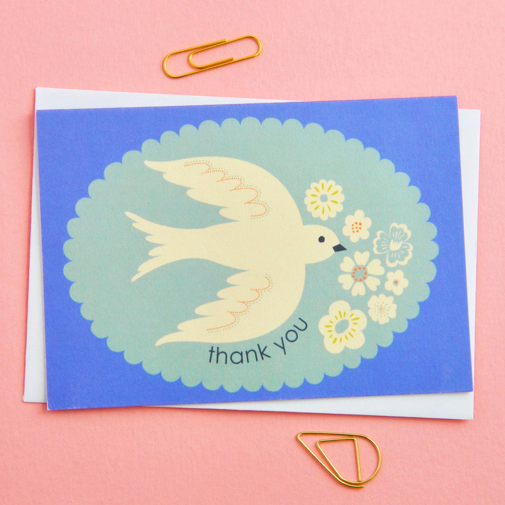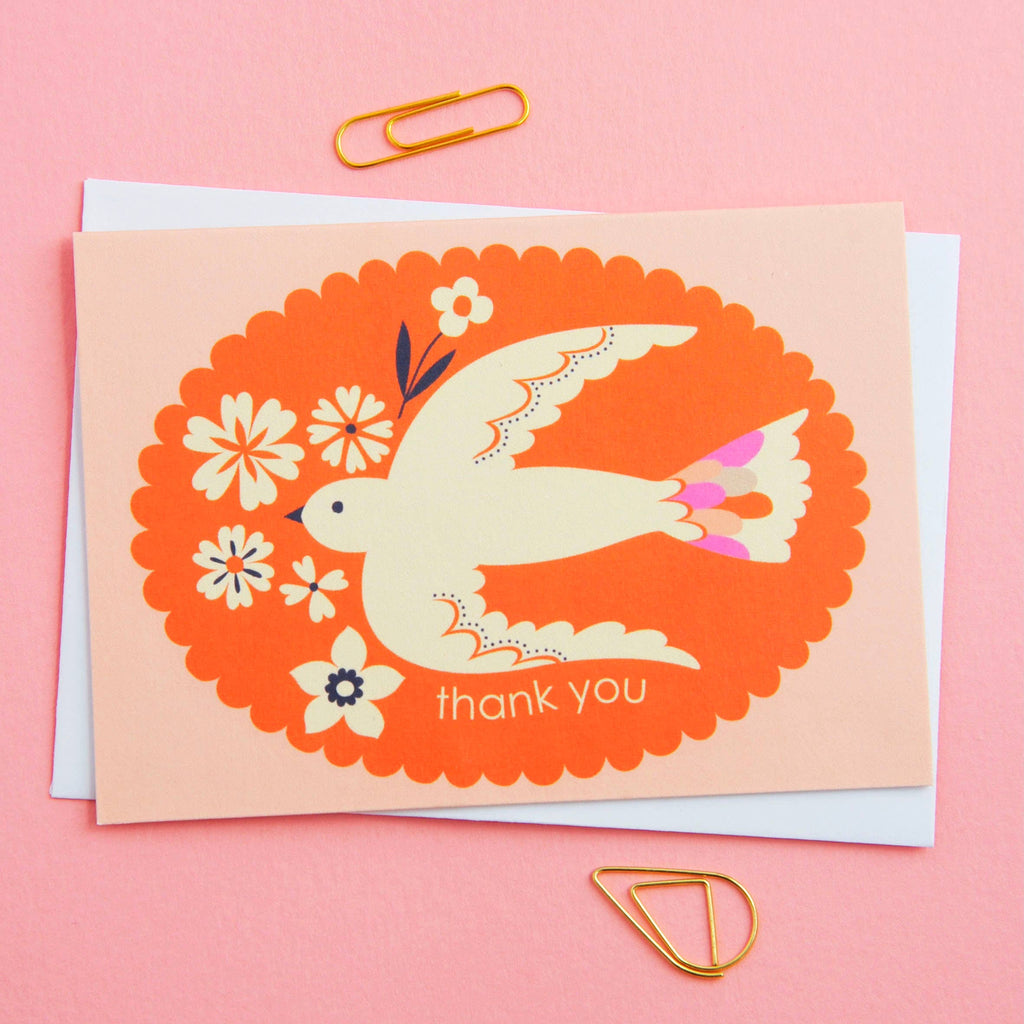 A joyful and elegant set of thank you notecards, each featuring a beautifully illustrated bird surrounded by floral motifs and framed with a scalloped border. These vibrant designs bring charm and colour to every message, making them ideal for thoughtful notes, gifting, and everyday correspondence. Perfect for boutiques and lifestyle stores looking to offer customers a design‑led, eco‑conscious stationery option. Whether used for birthday thank‑yous, bridal showers, teacher notes, or heartfelt messages throughout the year, this set adds a touch of delight to every occasion.