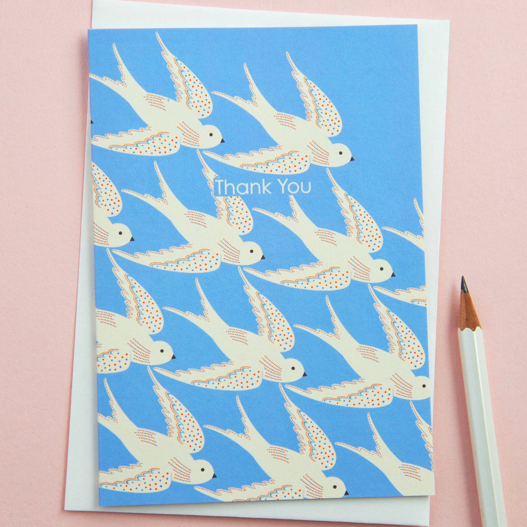 Birds in blue thank you greetings card. Card size: 105 x 150mm Comes with a cream envelope and packed in a biodegradable cello wrap. Printed in the UK on FSC credited 350gsm card. Matt finish. This card is left blank inside