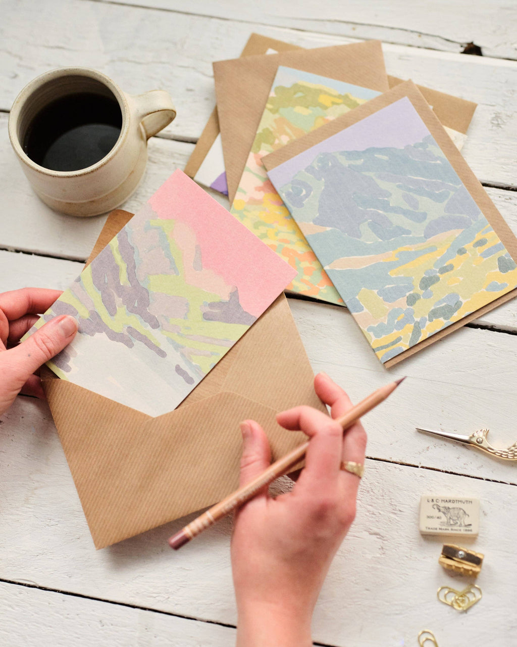 This card features a painterly illustration inspired by the Ben Nevis valley and mountains in Scotland in a pretty blue tonal palette.