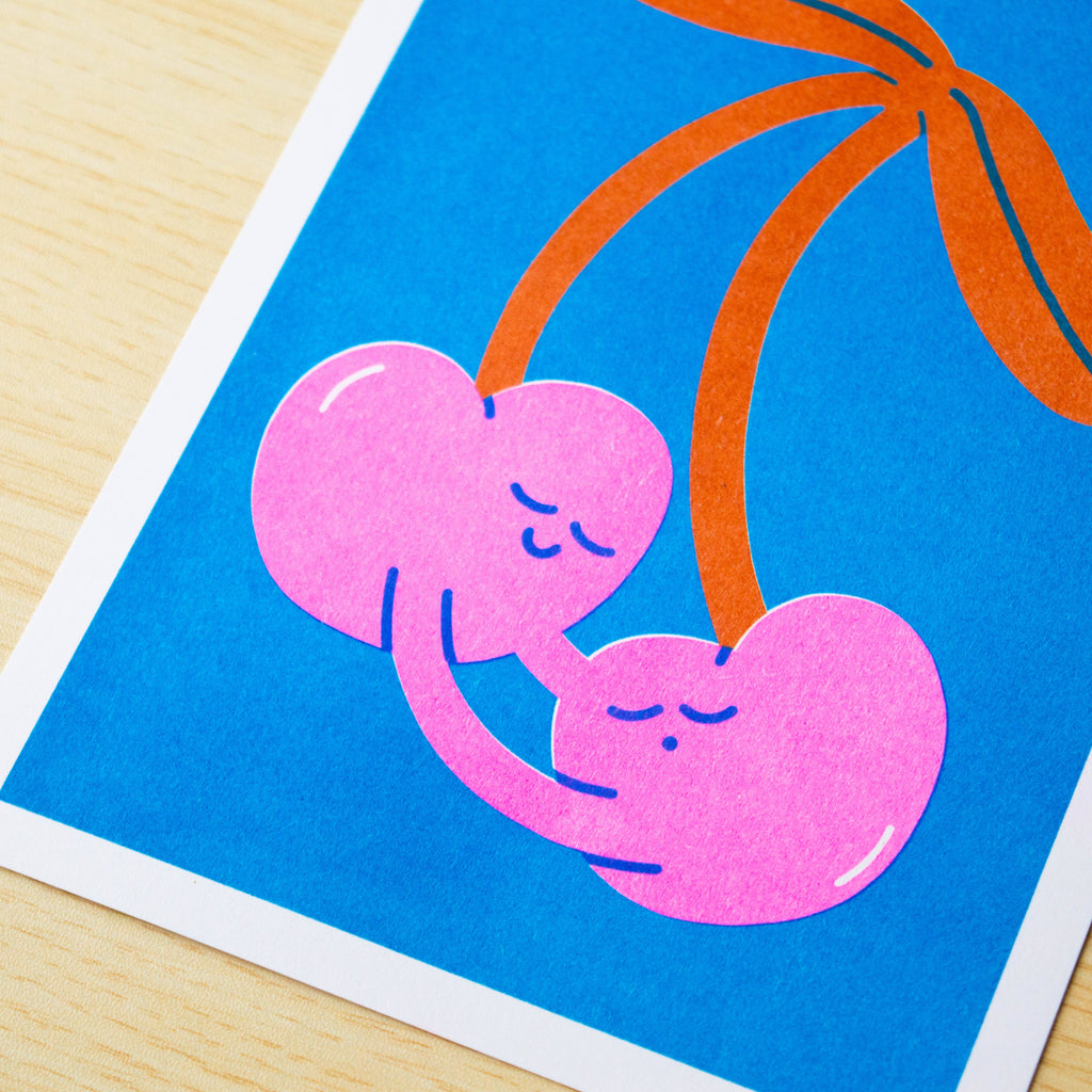 'Cherries' A5 Risograph Print, signed and packaged with a card backing and biodegradable cello sleeve.