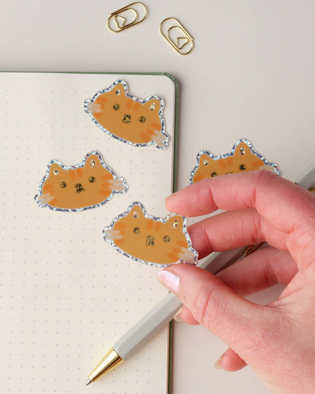 Cute ginger cat holographic sticker. Perfect for decorating your favourite planner, water bottle, laptop or whatever you wish! This adorable sticker will bring some joy and happiness to your day. Suitable for outdoor use.