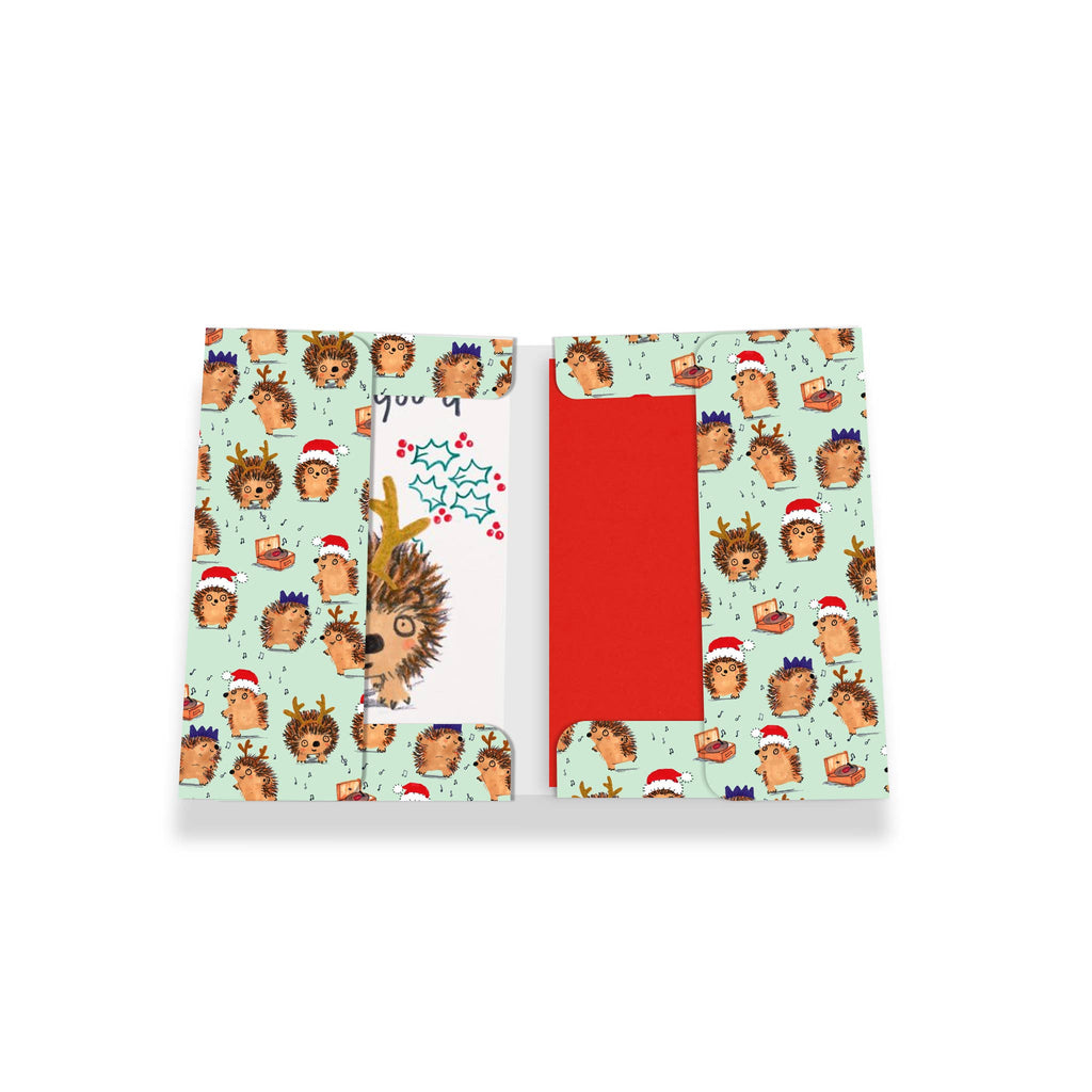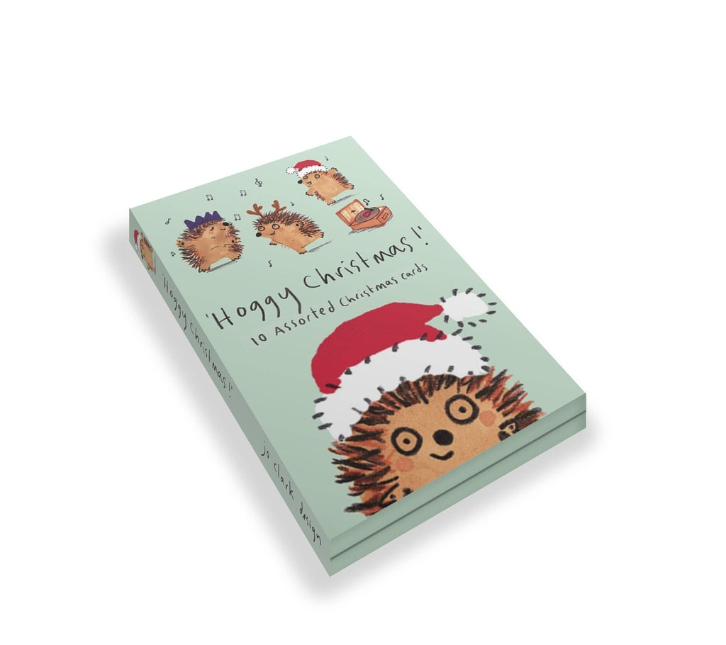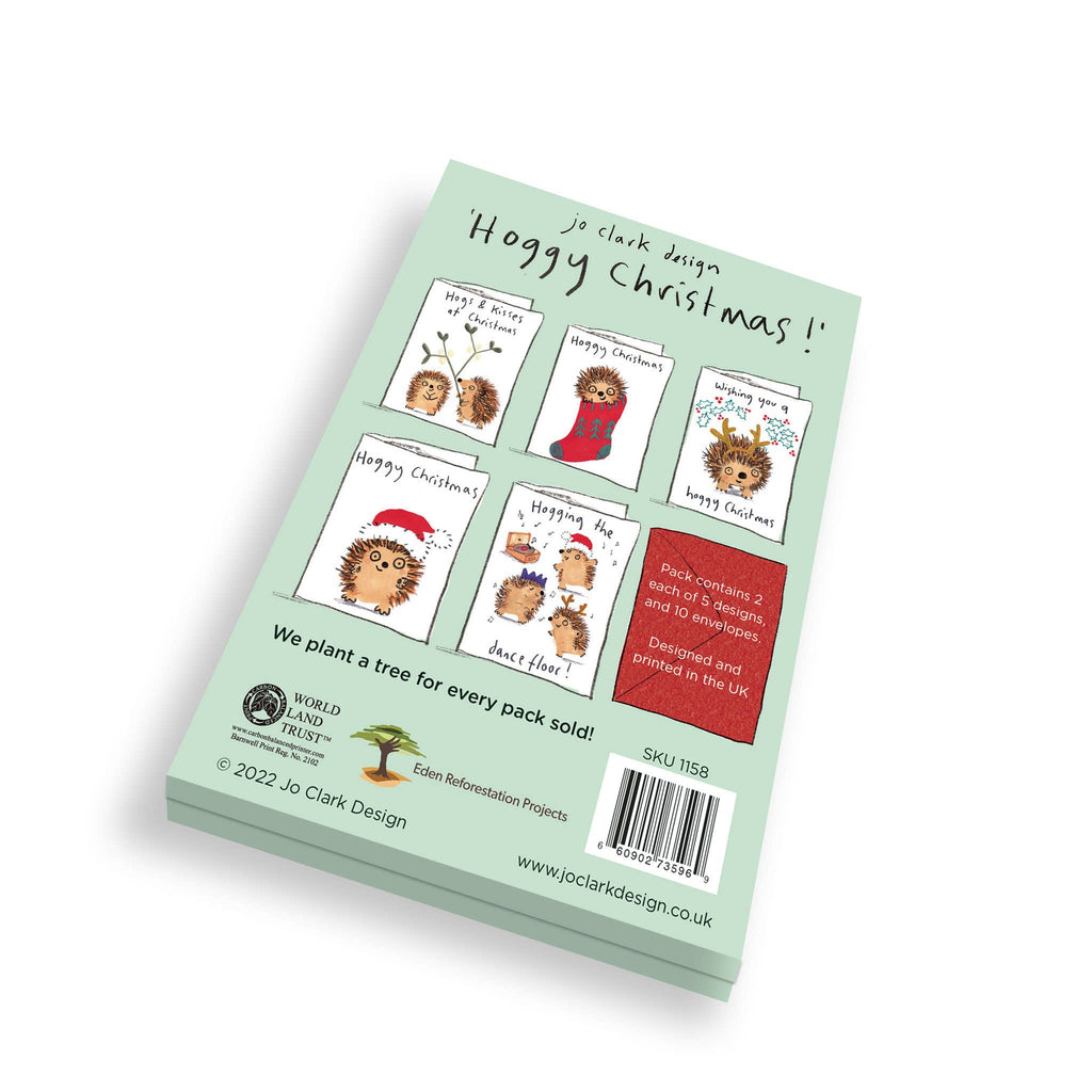 This multipack card wallet contains 2 each of 5 designs from our Hoggy Christmas card range, featuring hedgehogs celebrating the festive holidays.