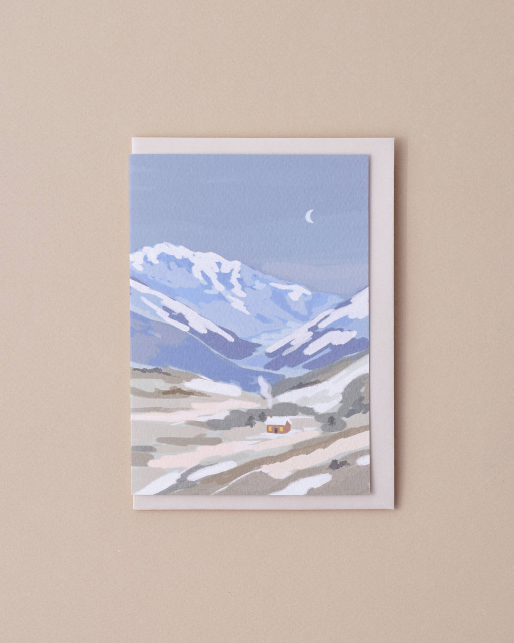 This card features a painterly illustration of a cosy cabin in the snowy mountains in a pastel tonal palette.