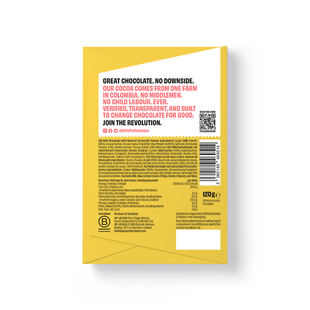 UP-UP Limoncello Chocolate is inspired by Italy’s beloved liqueur. Crafted with Single Estate 35% cacao from fine flavour cocoa beans grown at the renowned "El Rosario" farm in Colombia’s Necoclí region, this bar is infused with the vibrant zest of limoncello flavour. The result is a delightful blend of creamy sweetness and refreshing citrus notes, offering a perfectly balanced and taste of sunshine in every bite.