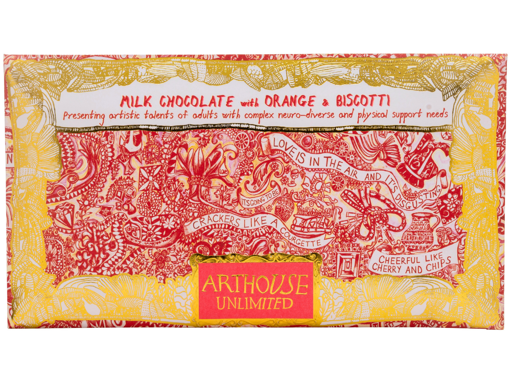 This luxurious milk chocolate bar with orange and biscotti, is made in the UK with responsibly sourced single origin cocoa. Wrapped in coloured foil & encased in a recyclable envelope, this bar features the ARTHOUSE Unlimited artists original 'Love is in the Air' artwork presented in a shimmering gold frame. An ideal gift for chocoholics, art lovers & good-cause supporters everywhere!