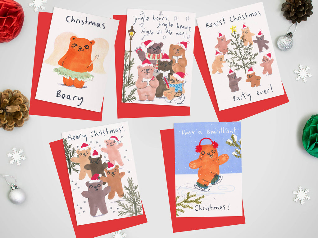 This multipack card wallet contains 2 each of 5 designs from the Beary Christmas card range, featuring bears taking part in festive activities.