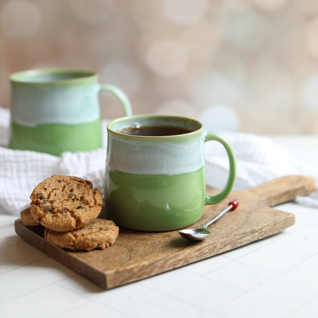 One of the freshest glaze options for these handmade ceramics, the pea green handmade coffee mugs, are a gorgeous addition to your kitchen shelves.