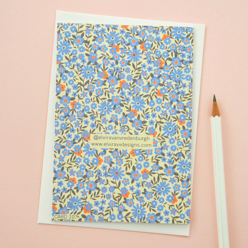 Pretty floral congratulations cards in blue, grey and cream with hints of coral. Card size: 105 x 150mm Comes with a cream envelope and packed in a biodegradable cello wrap. Printed in the UK on FSC credited 350gsm card. Matt finish. This card is left blank inside.