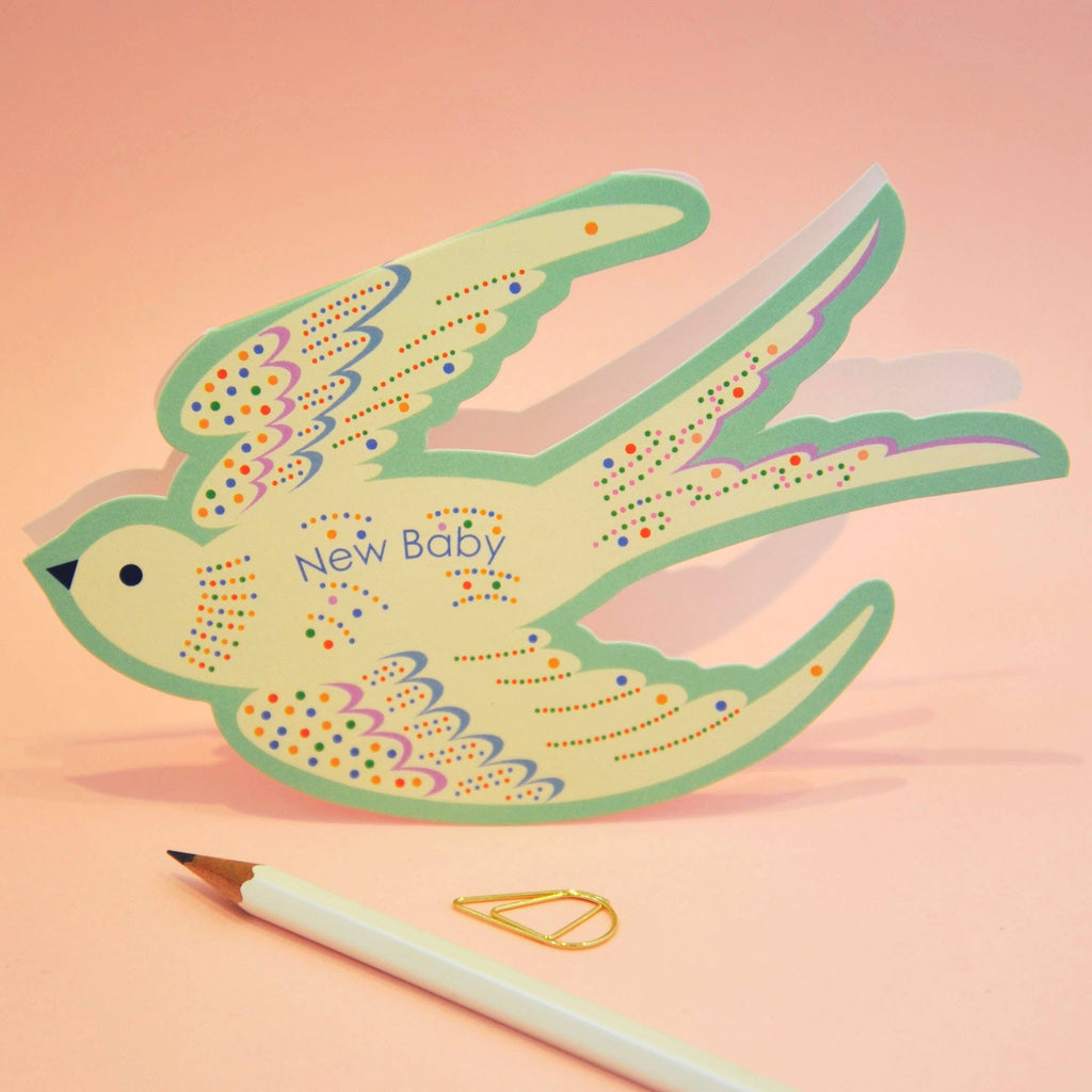 Welcome a new arrival with this delightful die-cut new baby card in soft mint green, adorned with cheerful, multicoloured dots. Its unique rocking design makes it a keepsake to treasure, perfect for displaying on a mantelpiece or nursery shelf. More than just a card, it’s a charming little gift in itself.