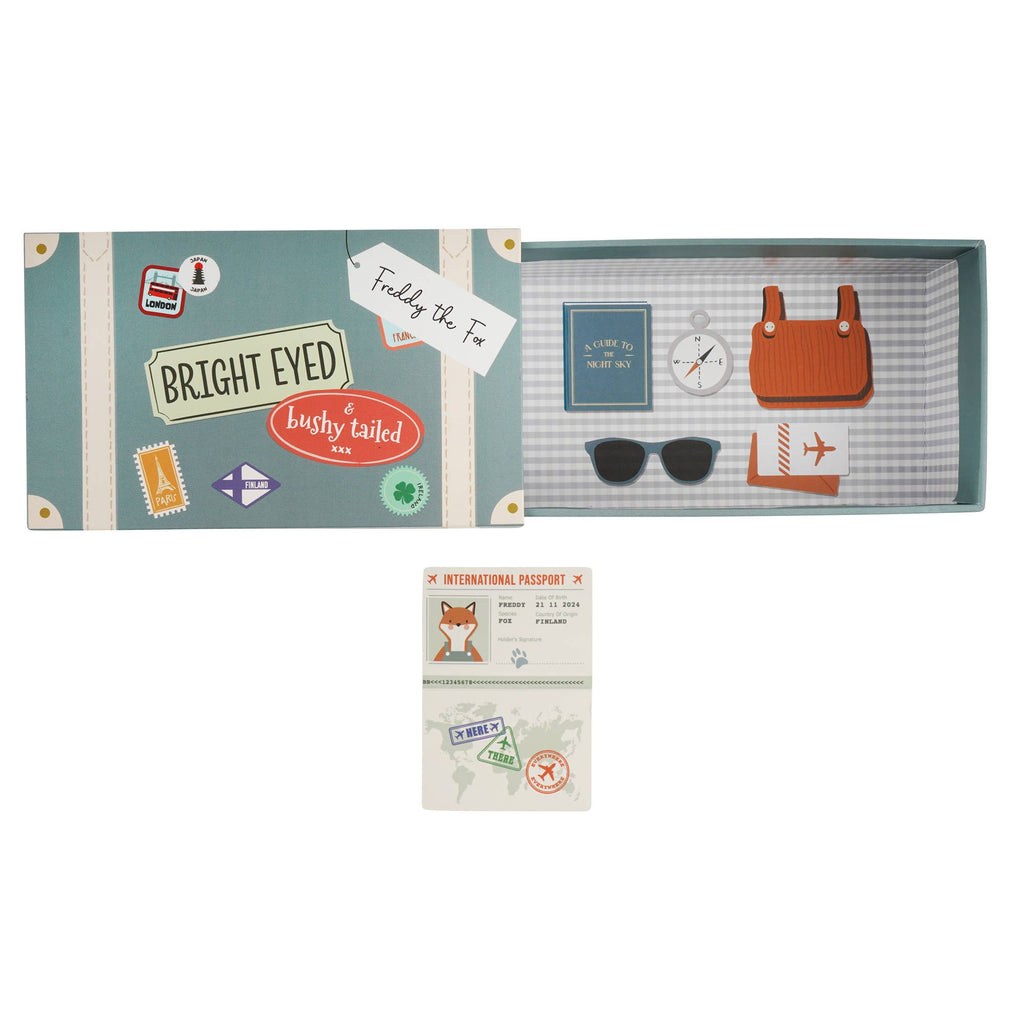 A lovable travel-ready companion, perfect for little explorers and thoughtful gift-givers alike. Presented in a beautiful suitcase-style box, designed to look like a tiny travel case, featuring charming printed details. It doubles as a keepsake box and a play accessory. Freddyhas his own dedicated mini passportincluded for imaginative journeys, complete with make-believe stamps from his travels.