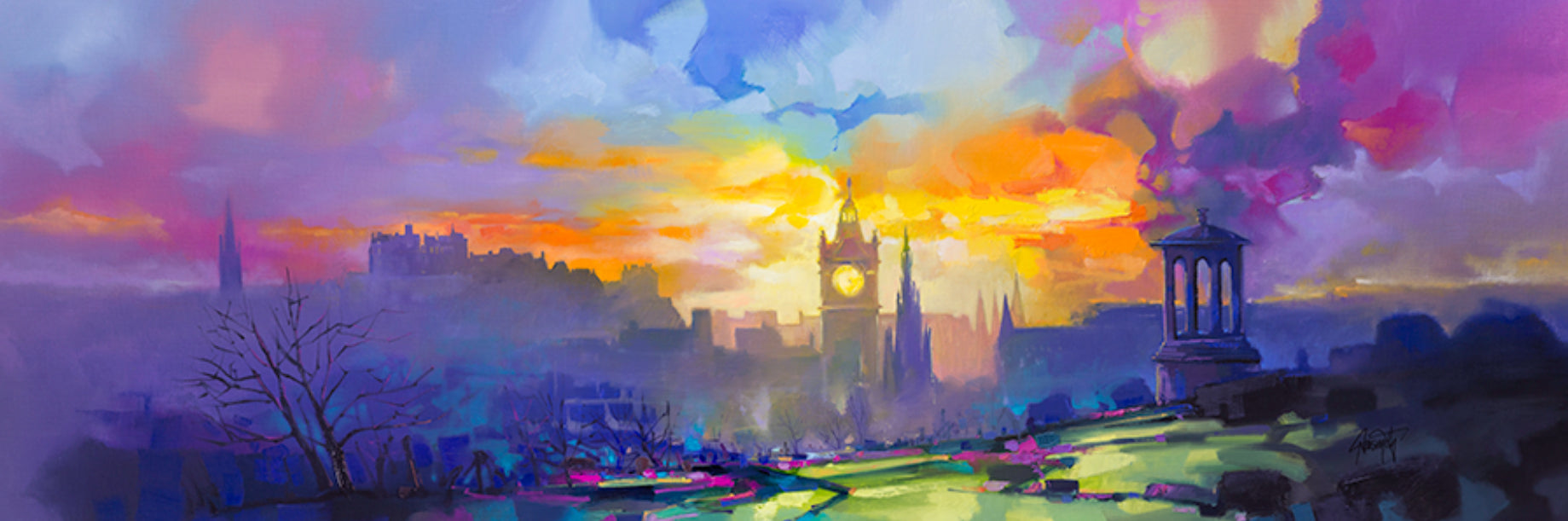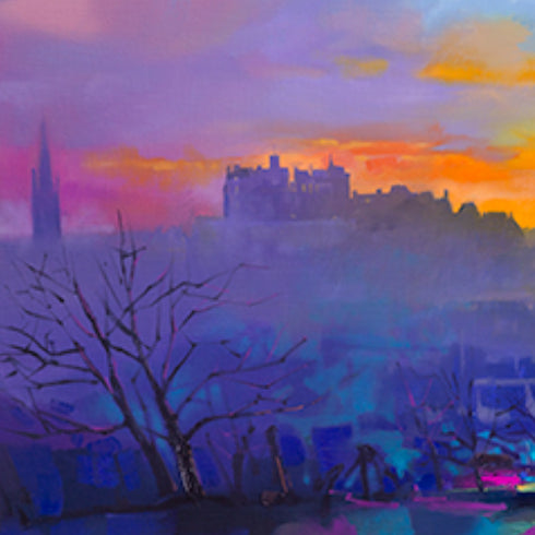 This Scottish print is taken from an image that was painted on Calton Hill in Edinburgh, Scotland. Scott often uses drones to take images of the landscapes below, this gives him a very different vantage point and shows the light in different ways. This print has a colour palette of blues, purples, greens and warm yellows, it feels very calm and peaceful.