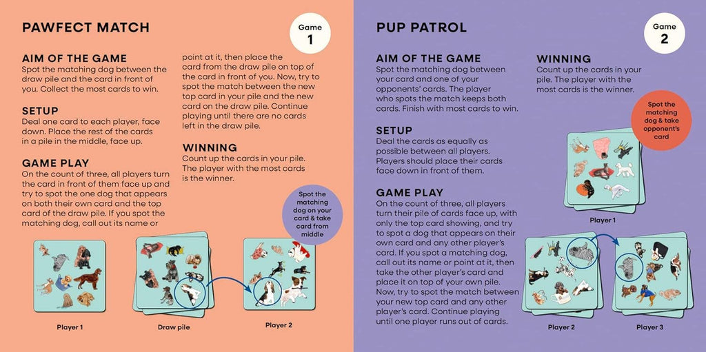 Fast-paced fun for the whole family: a screen-free, social game that will be familiar to fans of spotting games, like Dobble. Includes fun breed facts and personality profiles: the booklet contains rules for three ways to play, plus the names of all the dog featured and a bit about each one.