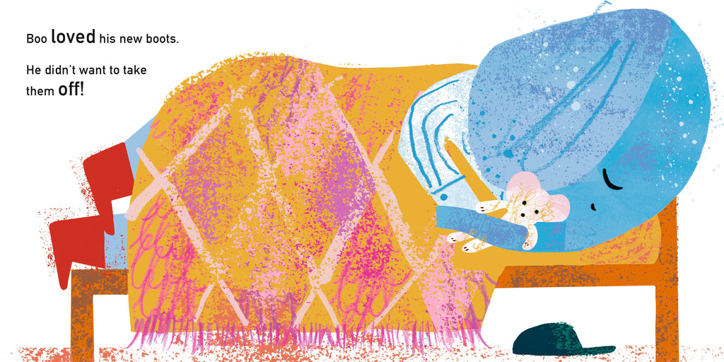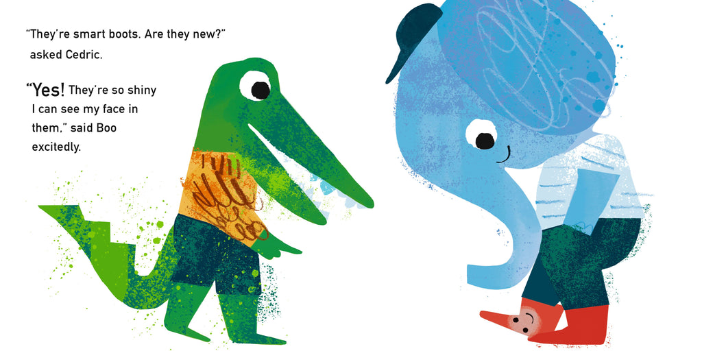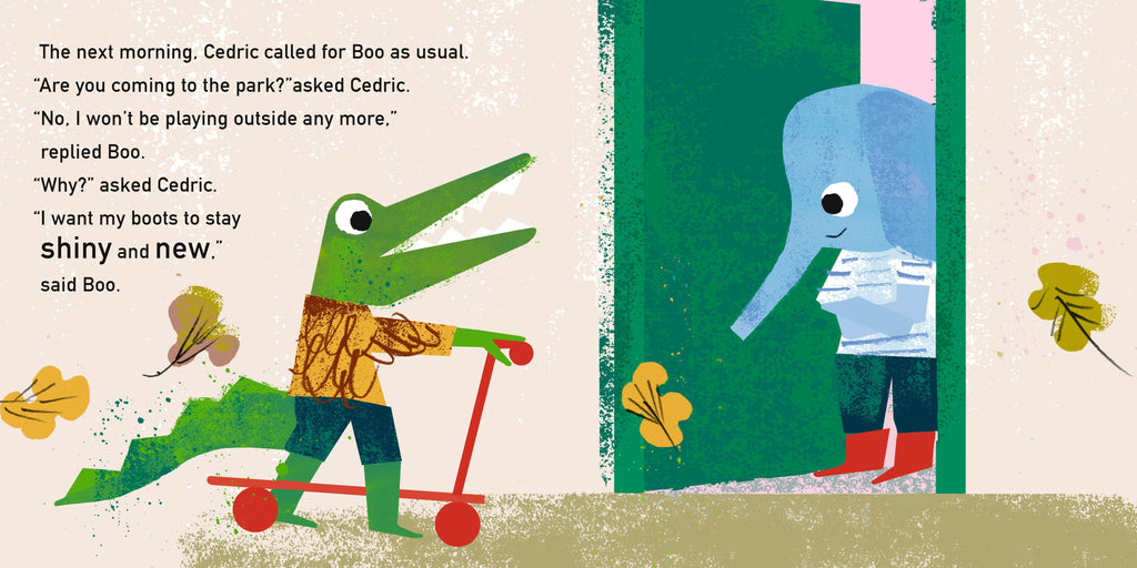 Boo the elephant has just bought a pair of shiny new boots. They’re so shiny that he can see his face in them! He can’t stand the thought of getting them dirty, so he decides to give up playing outside. But Boo misses playing in the park with his best friend, Cedric the crocodile, and can't help but join him in running through the autumn leaves. Now his boots are all muddy! But maybe all the fun he has with Cedric is more important.