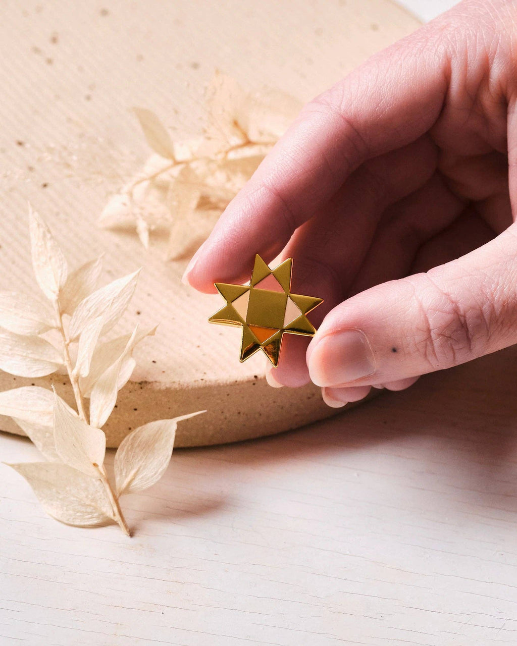 Luxury hard enamel pin badge of a traditional patchwork quilting Ohio star design on a gold background with lovely tones of pink, cream and orange. Inspired by folk art and vintage patchwork quilts. The perfect gift for a sewer or quilter.
