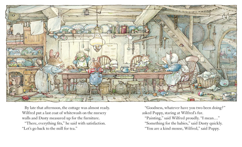 Poppy and Dusty and their three new babies live at the top of the flour mill. It isn't at all convenient -- the mill is very dusty and noisy and there are too many stairs. But what can be done? The mice of Brambly Hedge come up with a plan in no time at all and on the babies' Naming Day, Poppy has the most wonderful surprise!