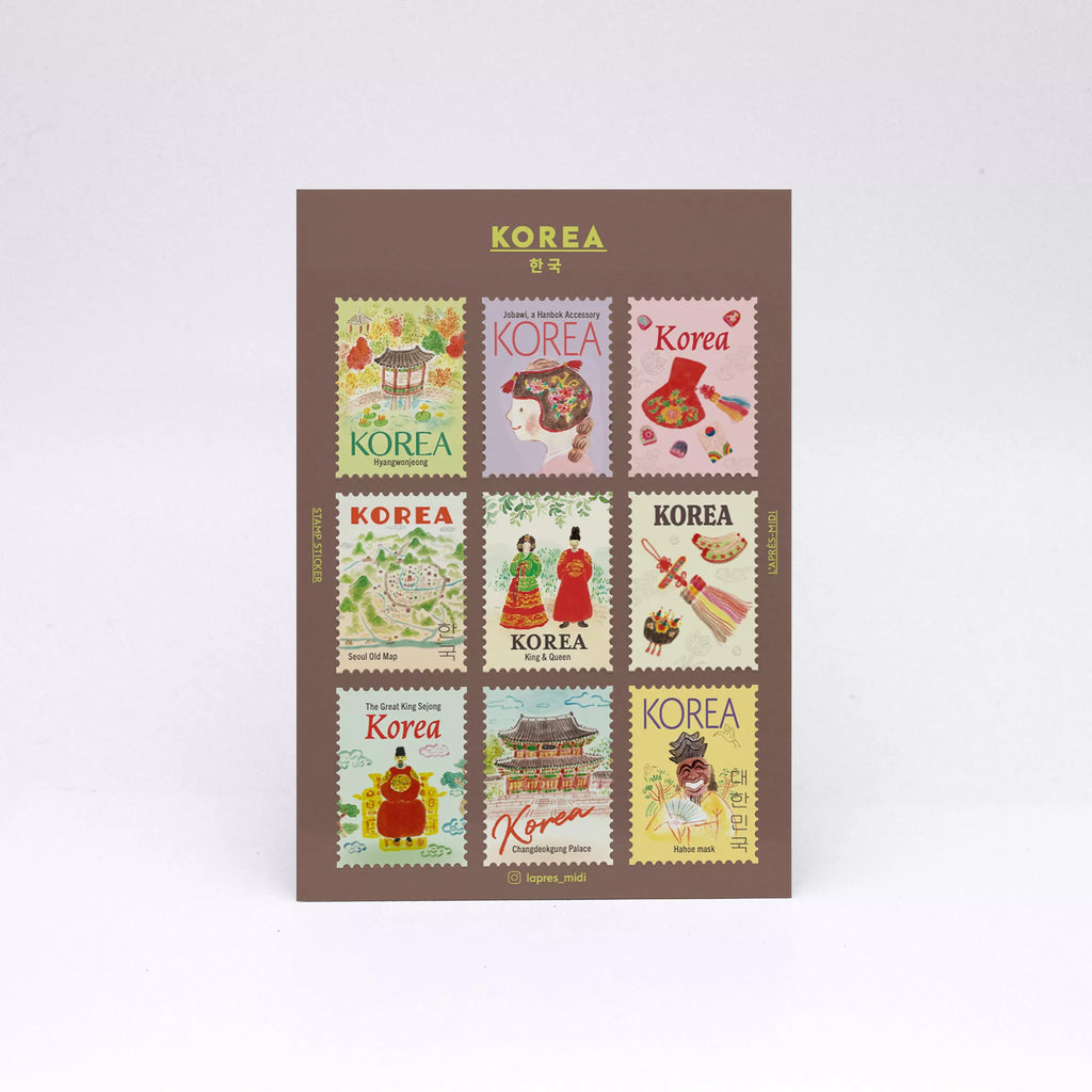 Sticker sheet with nine stamp-shaped city illustrations stickers.
