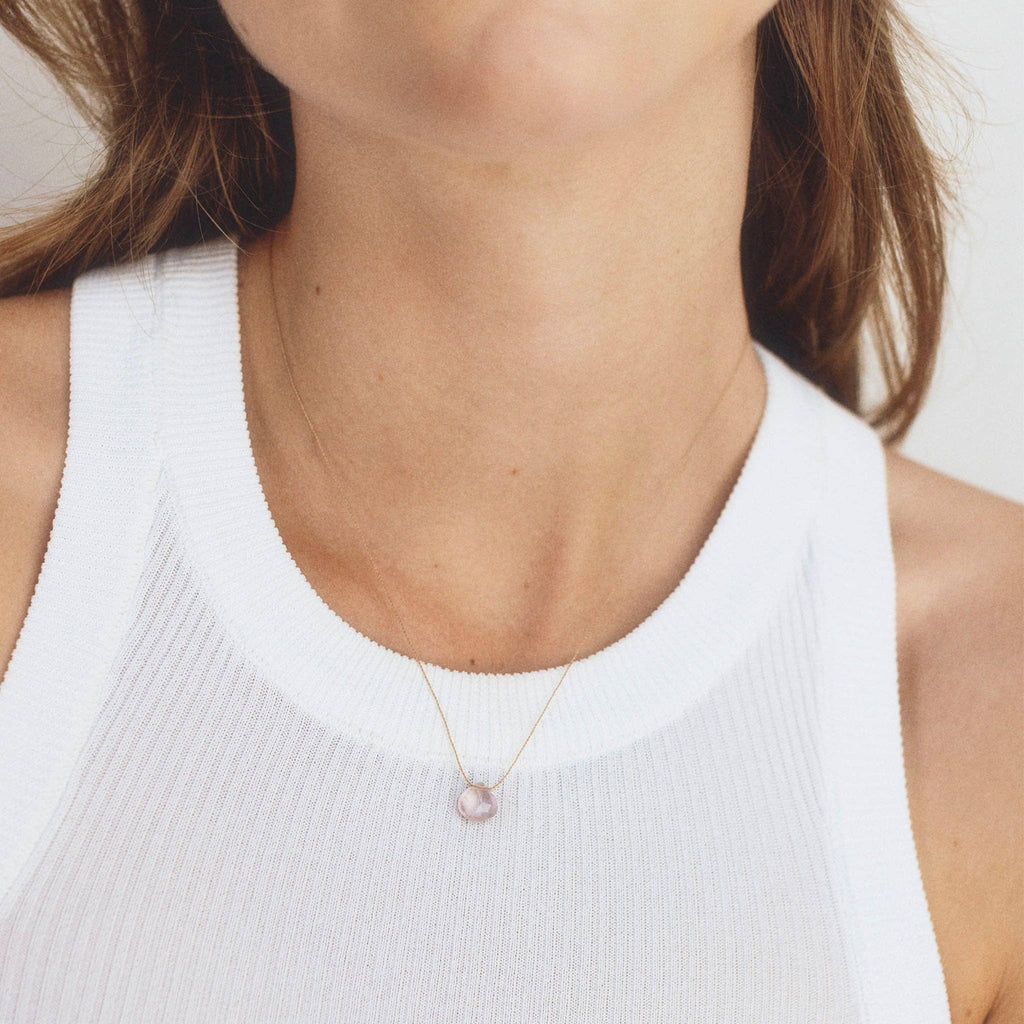 A rose quartz gemstone in Wanderlust Life's signature faceted shape slides on a delicate fine cord necklace.