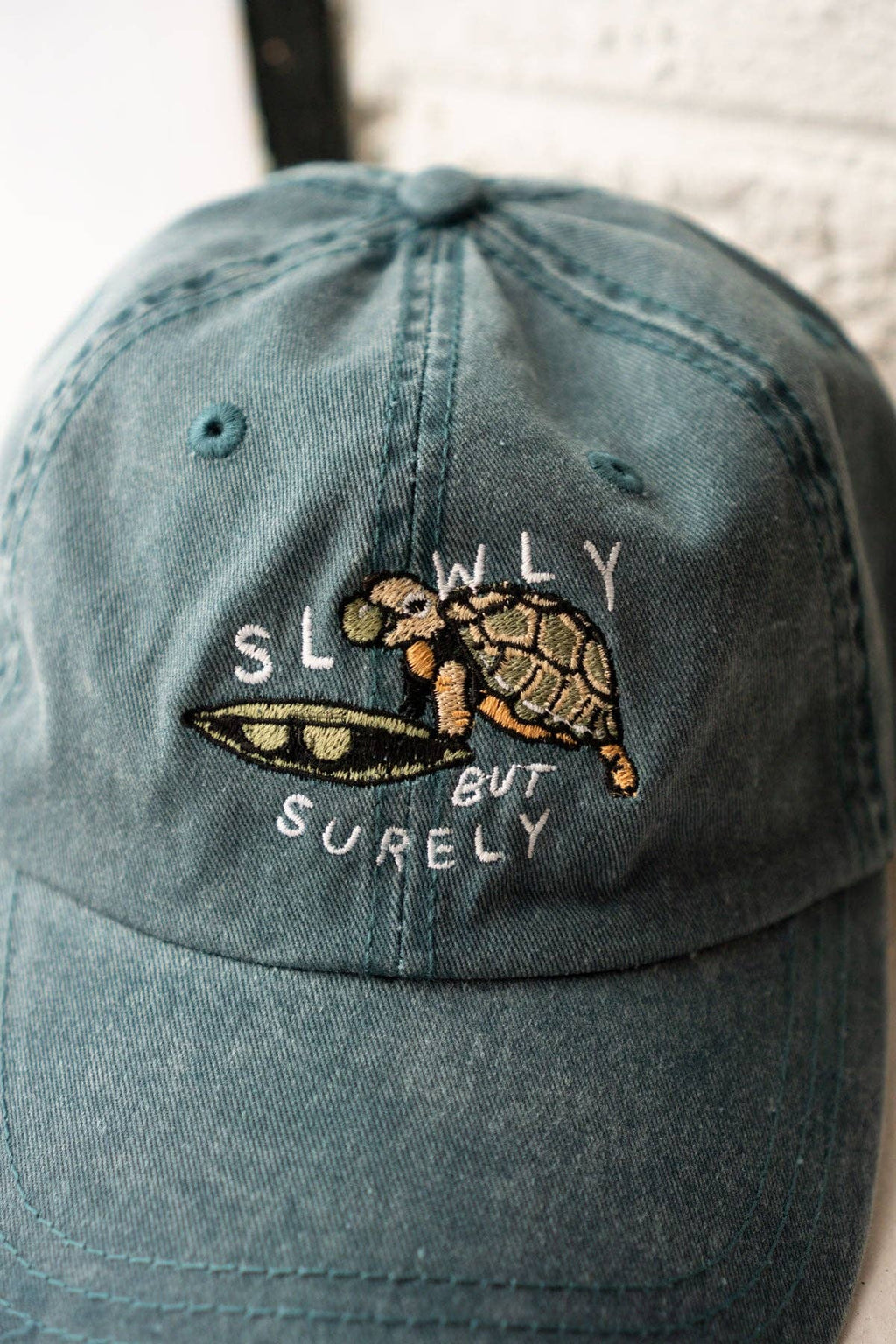 A sweet pea eating a sweet pea. This turtle is making its way through lunch, slowly but surely. This is a six panel, unstructured, low-profile baseball cap aka dad hat in a pigment dyed, vintage-look teal.