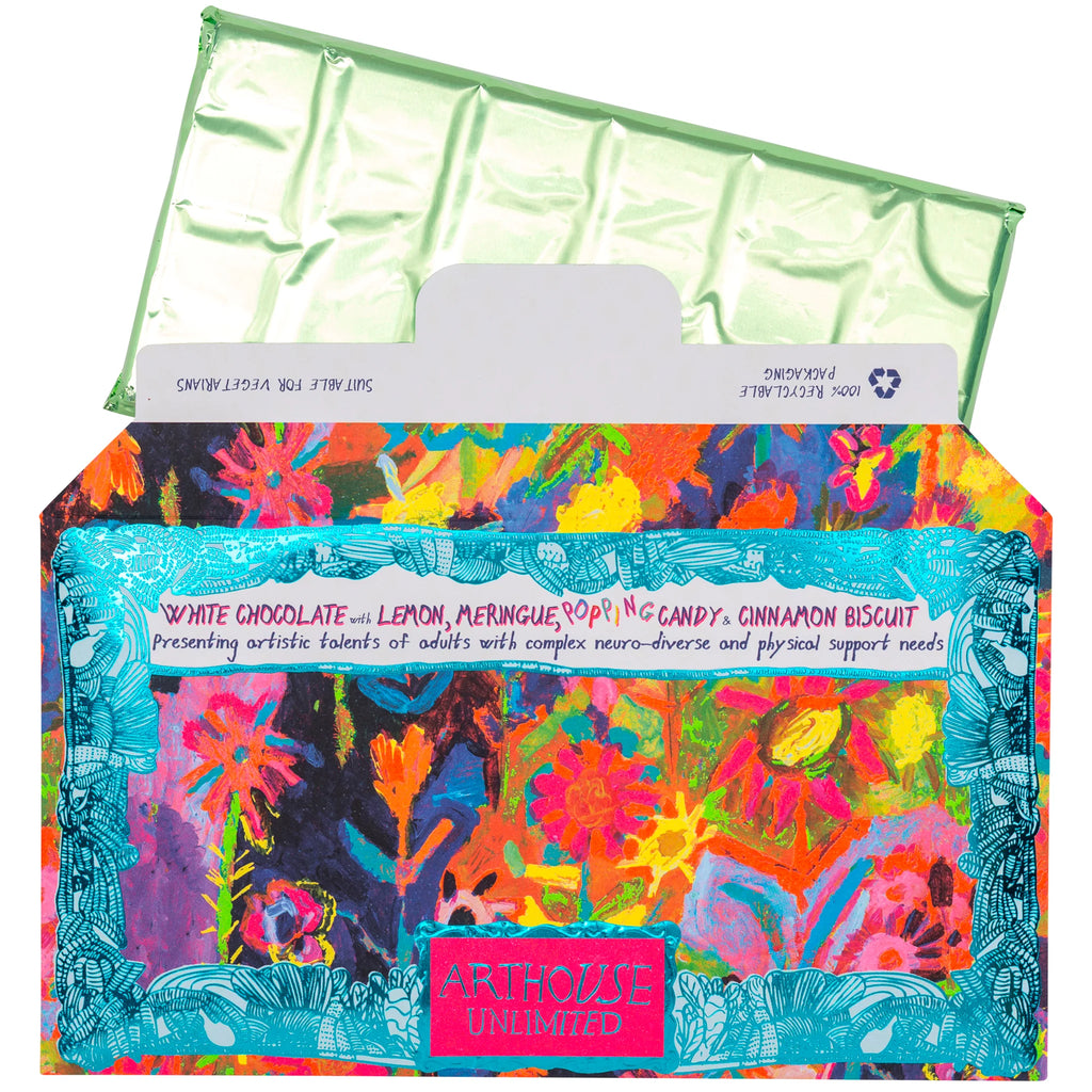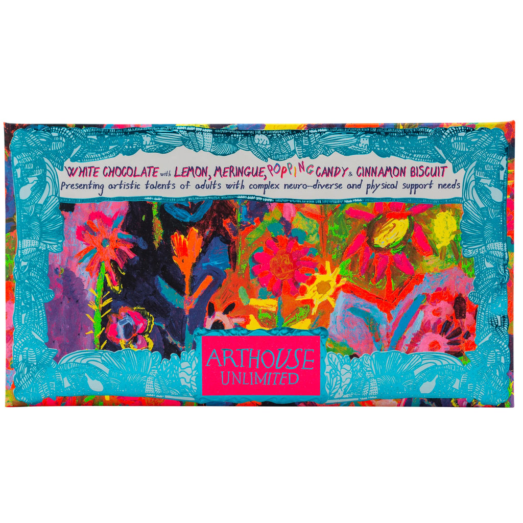 A creamy white chocolate bar with crunchy meringue & warm cinnamon biscuit, followed by a tang of lemon & finished with a burst of popping candy joy! Made in the UK with responsibly sourced cocoa, wrapped in coloured foil & encased in a recyclable envelope, this bar features artist Sarah Harbott's original artwork presented in a dazzling turquoise frame. An ideal gift for chocoholics, art lovers & good-cause supporters everywhere!