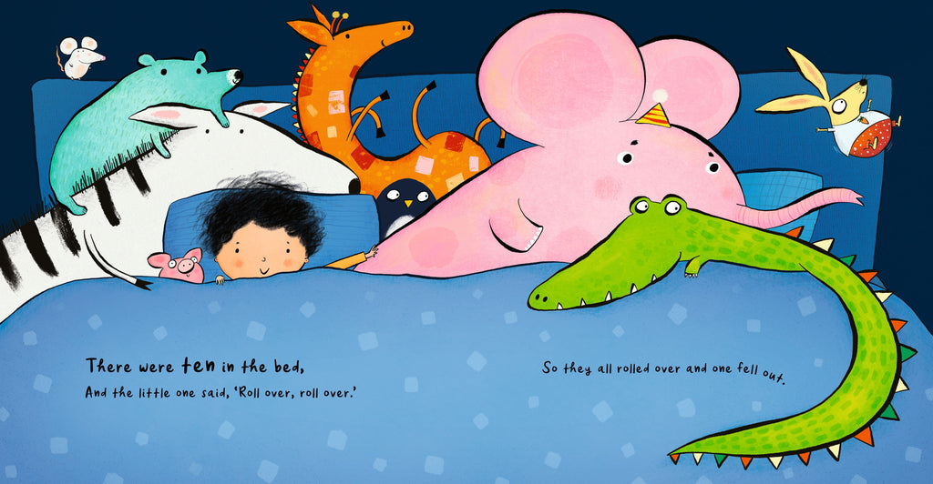 Bright, colourful counting fun in a new take on the favourite song. There were ten in the bed and the little one said, "Roll over, roll over." So they all rolled over and one fell out... Sing along and count along with the irresistible and roll-icking nursery rhyme favourite!